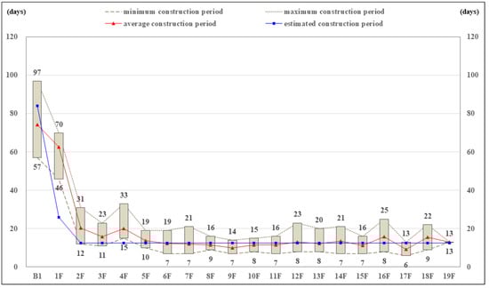Specifically, this result was examined according to the minimum construction period, the maximum construction period, the mean construction period, and the estimated construction period. The estimated apartment frame construction period per floor is generally located between the minimum and maximum frame construction periods. However, the estimated construction period for the ground floor, which was calculated as 26 days, was significantly lower than the executed construction period (46 days minimum and 70 days maximum). Moreover, when comparing the minimum construction period and maximum construction period for each floor of the eight buildings, the deviation in the construction period for each floor of the framework was analyzed to be 40 days for the basement, 24 days for the first floor, and 29 days for the second floor.