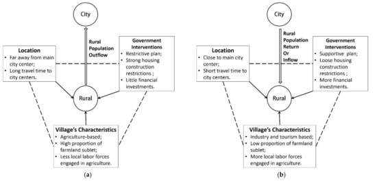 Theoretical framework of factors influencing rural housing vacancy (RHV) rates in metropolitan suburbs: (a) village with rural population outflow and high RHV rate; (b) village with rural population return/inflow and low RHV rate. (Source: These figures are depicted by the authors).