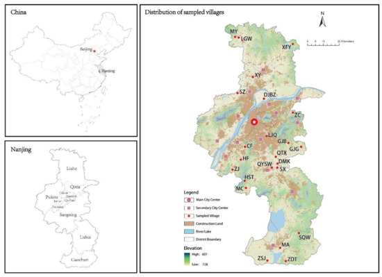 This paper takes villages in Nanjing’s metropolitan suburbs as the research area. Nanjing is the capital of Jiangsu Province and an important central city in eastern China. It covers an area of 6587 Km2 and has 11 administrative districts. In 2019, Nanjing’s GDP was 1171.5 billion yuan, its registered population was 6.81 million, and its permanent population was 8.27 million. Nanjing’s urbanization rate reached 82% in 2019, which is much higher than the national average level. As is typical for metropolitan areas in China, over the past two decades Nanjing has formed a polycentric and networked spatial structure [52].