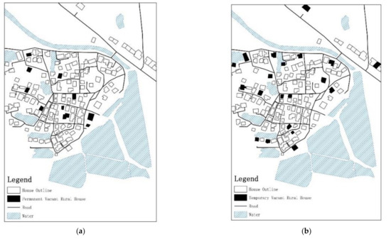 Distribution of two types of vacant rural houses in a sampled village: (a) permanent vacant rural houses in ZDT; (b) temporary vacant rural houses in ZDT. (Source: These maps are depicted based on the authors’ field survey data).