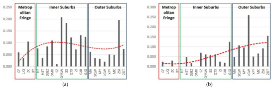 Clearly, both Figure 5a and Figure 6 suggest that there is an unusual “middle bump” of permanent RHV rate in metropolitan suburbs. In this study, we find that the average permanent RHV rate is highest for villages that are located in the inner suburbs of Nanjing and have a medium travel time to city centers. The authors’ findings are different from the law of RHV rate changing proposed by Song and Li. They advocate that the closer the villages are to city centers, the lower the RHV rate of the villages will be because they are close to workplaces and it is easy for migrant workers to move in [30,32]. Our findings are also different from the studies of Qiu and Tao. They argue that villages close to city centers have a higher RHV rate and the underlying mechanism is that in villages close to the city it is easier for residents to move to the city, so they are more likely to abandon their rural houses [33,34].