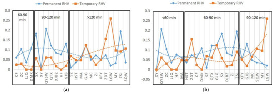 Figure 6a shows the relationship between the travel time by public transportation from a village to the main city center and its RHV rate. Similar to the above-discussed empirical results, the permanent RHV rate does not increase as the travel time increases while the temporary RHV rate is generally in line with our theoretical expectation. In fact, villages that are about a 90–120 min drive away from the main city center have a relatively higher permanent RHV rate than those that are located less than a 90 min drive away from the main city center. Figure 6b shows the relationship between the travel time by public transportation from a village to the secondary city center and its RHV rate. Obviously, we can observe very similar results as shown in Figure 6a.