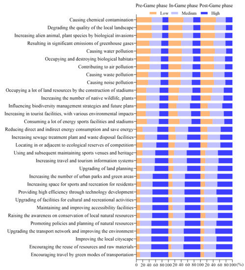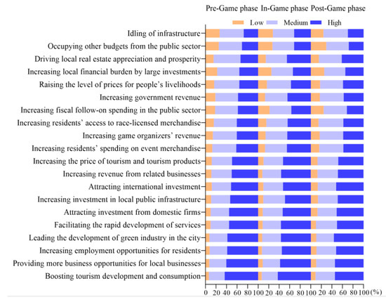 Ten general public indicators (i.e., economic efficiency, transport efficiency, public safety, social welfare, education, living comfort, water use, resource self-sufficiency, ecological sustainability, and environmental management) were adopted by this study as indicators of urban sustainability (Table 8) [78]. As shown in the table, the agreement level of economic efficiency was high in all three phases (M = 2.63; 2.47; 2.43, respectively), while the agreement level of transportation efficiency and resource self-sufficiency was higher in the pre-game (M = 2.41, 2.40) and in-game phases (M = 2.44, 2.45), and the agreement level of living comfort was higher in the in-game (M = 2.43) and post-game (M = 2.44) phases.