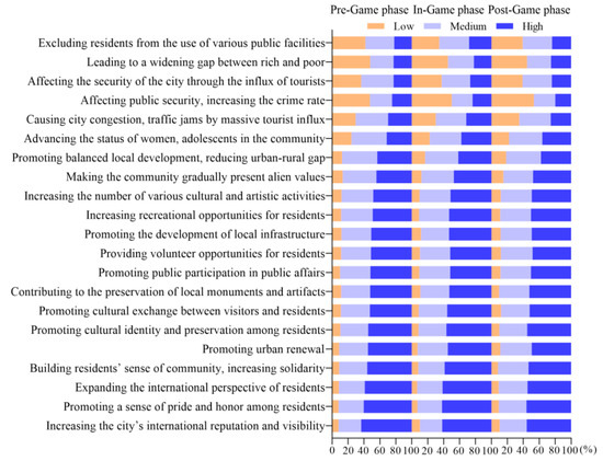 Through sport, thanks to extensive participation programs, we now have an important source of national identity; national pride resulting from excellence in international and regional competitions; and economic growth through a thriving sports industry program. The prestige and competitive spirit associated with hosting the Olympics may leave a legacy of national pride and solidarity. It can also improve education and raise awareness of cultural values [76]. Let us understand the impacts of the Winter Olympics on the social sustainability of the host city from the public perspective (Figure 4 and Table 4). All items are listed in Figure 4 according to the progressive increase in the frequency of the pre-game phase, while Table 4 shows the mean and standard deviation of all items.