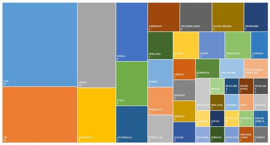 As Figure 2 shows, the USA (25 papers, 15.7% of the sample) are the country that contributes most to management research related to COVID-19. The UK follows (18 papers, 11.3% of the sample) and China (14 papers, 8.8% of the sample). Analyzing the aggregated data by continents we observe how Europe provides numerous reflections on the issue (21 papers, 13% of the sample). An explanation of the relevance of the USA, China, and Europe can be given by the strong resonance that COVID-19 had for the initiation and subsequent development of the pandemic in these contexts.