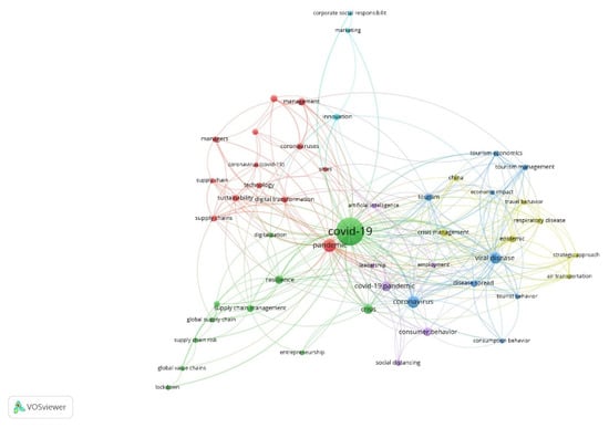 The most used keywords are COVID-19 with 91 occurrences, Pandemic with 19 occurrences, Coronavirus 17 occurrences, Viral disease 15 occurrences, etc. (See Table A2 for more details.) In particular, the size of the label and the marker of a key word is determined by the weight of the item. The higher the weight of a keyword, the larger the label and the marker of the item. Obviously the most used word is COVID-19, the core keyword for the study of the pandemic (green circle). Moreover, the lines between different keywords represent the links. Numerous categories of analysis branch off from the central key word, which partly anticipate the subsequent study of the topics (i.e., innovation, digital, and consumers). The analysis highlights 6 main clusters in which the keywords are grouped in terms of combinations (see Table 4). In each cluster appears one or more terms referring to the pandemic (i.e., Coronavirus Disease, Coronavirus, and Epidemic) with related keywords that highlight the orientation of the studies in a first vision (i.e., marketing, strategy, supply chain, and consumers). Cluster 1 is the one that contains the largest number of keywords and highlights the connection between digital transformation, management, sustainability, and pandemic management. Cluster 2 focus mainly on supply chain management. Cluster 3 reports on some aspects of tourism as well as Cluster 4 focused on air transport. Cluster 5 seems consumer-oriented while Cluster 6 analyses Corporate Social Responsibility (CSR) and the links with innovation and marketing. From the analysis of the clusters it is possible to state that keywords linked to the topic of innovation are recurrent (highlighted in italics in the table). Subsequent analyses will further underline this evidence.