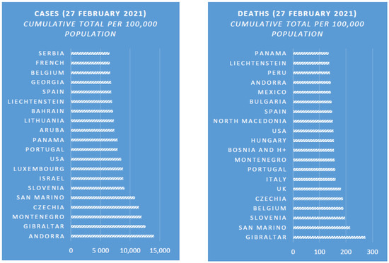 A number of important observations can be made about the epidemic. The evolution of the pandemic has varied greatly across nations and these trends have been dependent upon the specifics of the virus itself and the variations in responses by various countries around the globe. For example, China, where COVID-19 is believed to have been originated, to date, has had less than 90,000 cases compared to 4.6 million cases in the U.S., equating to 0.006% cases in China, compared to 27% cases in the U.S., of the total number of cases in the world [21]. As of 2 August 2020, the five most affected countries in terms of the number of cases are the U.S., Brazil, India, Russia, and South Africa with 4.6 million, 2.7 million, 1.7 million, 0.8 million, and 0.5 million cases, respectively. The five most affected countries in terms of the number of deaths are the U.S., Brazil, Mexico, the U.K., and India with approximately 154,000, 93,000, 47,000, 46,000, and 37,000 deaths, respectively [21]. These numbers were at the time of the first submission of this article. As of 27 February 2021, the time this first revision of the article was submitted, the five most affected countries in terms of the number of cases are the U.S., India, Brazil, Russia, and the United Kingdom with 28.33 million, 11.04 million, 10.32 million, 4.16 million, and 4.15 million cases, respectively (based on the population reported in [22], the respective incidence rates of the number of COVID-19 cases per 100,000 population for these countries are 8559, 800, 4856, 2851, and 6112). The five most affected countries in terms of the number of deaths are the U.S., Brazil, Mexico, India, and the U.K. with approximately 506,000, 250,000, 183,000, 157,000, and 122,000 deaths, respectively. The respective incidence rates of the number of COVID-19 deaths per 100,000 population for these countries are 152, 118, 142, 11, and 178. Figure 1 provides information for the top 20 countries in the world in terms of the incidence rates of COVID-19 cases and deaths.