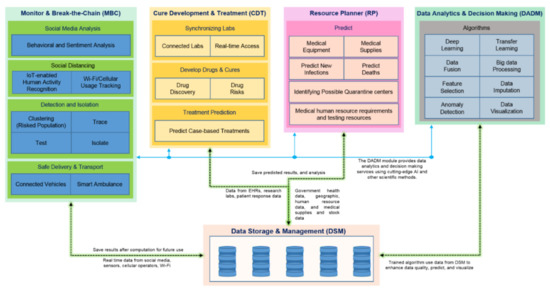 The MBC module monitors the environment using a range of Internet of Things (IoT), social, and other sensors to detect potential pandemics and other anomalies and takes necessary actions. The actions include contact tracing, maintaining physical distancing, and others. The CDT module is aimed at developing various cures for pandemics and these could include mainstream drugs, vaccines, and natural remedies. The RP module plans the required resources and the provisioning of these resources. The resources include testing and medical equipment and supplies, quarantine and treatment centers, and human resources. The DADM module provides data analytics and decision-making services using cutting-edge AI and other scientific methods. The DSM module manages big data, its storage, preparation, and provisioning. It could be located remotely (cloud), locally (edge), or somewhere in the middle (fog).