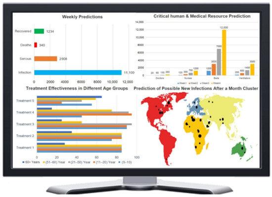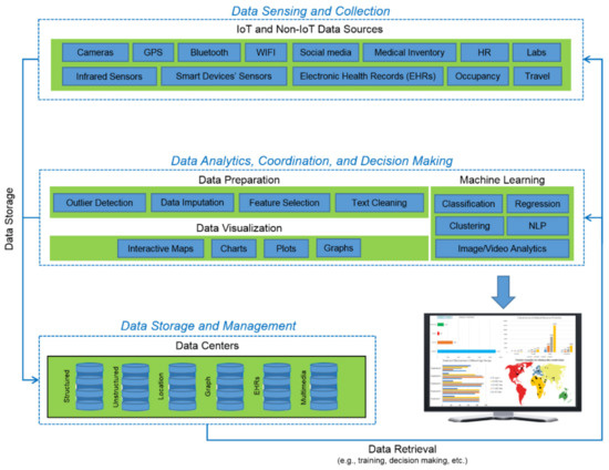 For managing and controlling COVID-19 effectively, Internet of Things (IoT) applications are used by some countries for surveillance and contact tracing, which is integrated with AI [70,71]. IoT and AI are widely used in the healthcare industry, such as IBM Watson which can find valuable insights from unstructured data and can even correct doctors in their prescriptions and diagnoses [100]. AI can answer several complex questions during the outbreak of infectious diseases. One such application is BlueDot; it is the first AI-based tool which quantified the global risks in the initial phase of COVID-19 in China. It communicated the risk factors to its clients. It anticipates the impact of infection using highly diverse datasets such as global flight itineraries, climate conditions, animal and insect populations, and the health system capacity of a specific region.