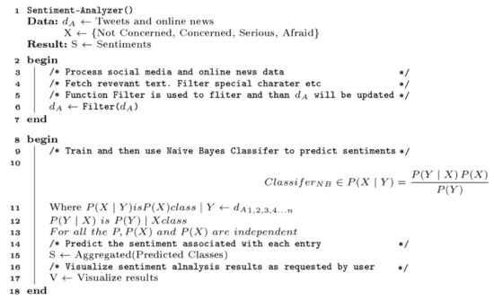 We used the R statistical platform for modeling and analysis. We gathered week-wise data from Twitter; 10,000 tweets were downloaded which include those of international leaders, organizations, and other famous personalities. We also used 50 published online news articles of well-known newspapers and magazines including The Guardian, Fortune, BBC, Wired, and Times. For collecting the Twitter and newspaper data, we used search keywords including corona, COVID-19, Corona Epidemics, Corona Recession, Corona Deaths, Corona Ventilators, Corona Job loss, etc. For sentiment analysis of the tweets, we first downloaded data based on the above-mentioned keywords into the R by using the twitteR package [106]. Data access is provided with the combination of the access token, access secret code, consumer key, and consumer secret, and is generated with the help of the Twitter API. Similarly, for online news media, we used Google to search for news articles related to the above-mentioned keywords. We then downloaded the data and imported it into R using the RCurl package [107]. The RCurl package filters out the useful text data from the HTML pages. We have used the Naïve Bayes algorithm for sentiment analysis. The Sentiment-Analyzer algorithm is given in Figure 6, which is self-explanatory.