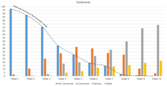 The results obtained from the Sentiment-Analyzer component show significant sentiment fluctuations, as depicted in Figure 7, among individuals, organizations, and governments. Sentiments are classified into four classes:not concerned, concerned, serious, and afraid. By class “Not Concerned”, we mean people that are not at all serious about COVID-19, whereas by type “Concerned” we mean that people are presuming it as a health threat. The third type “Serious” means that people are very serious about this infection and lastly “Afraid” type means that people are serious and frightened by this infection. Figure 7 depicts the week-wise aggregated sentiments of a particular type. It is evident in Figure 7 that in the first three weeks people were not much bothered about COVID-19 infection. However, from the fourth week onwards there was a significant shift in people’s perceptions toward COVID-19; as a result, only 41% of people are not bothered. At the same time, the percentage of people who are concerned, serious, and afraid started to increase significantly. Further, for the last two weeks, people who are not concerned are around negligible and almost 100% of people are from types concerned, serious, and afraid. This signifies that as COVID-19 infection grows from an epidemic to a pandemic, it greatly affects people’s sentiments. From the response perspective, the first four weeks are important because we can break the chain of virus transmission and the exponential growth as depicted in Figure 7. Therefore, if we can change the percentage of people who are not concerned about the infection in the first four weeks in Figure 7, that can break the chain significantly. This is due to the reason that people will follow government advisories and rules with seriousness and stick to social distancing. Figure 7 also serves as a source of information for the governments that they need to change and modify the way they want people to perceive the dangers of any highly infectious disease like COVID-19 in the initial stages.