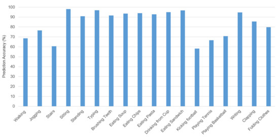We used the C5.0 decision tree classifier to predict activity classes. In Figure 8, we depicted the prediction accuracy of each class. The overall prediction accuracy is 84% and can be termed as satisfactory. Ten-activity class prediction accuracy is above 90%. However, the prediction accuracy of activity classes such as walking, kicking football, and playing tennis are below 70%. If we look more closely at Figure 8, we will find that the prediction accuracy of outdoor activities is lower compared to indoor activities. The average prediction accuracy of outdoor and indoor activities is 68.13% and 90% respectively. We can establish the fact that HAR is possible using machine learning. If the individual activity falls in prohibited activities during social distancing restrictions, the government can know it in real-time.