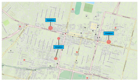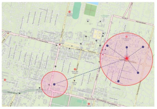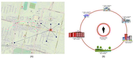 Wi-Fi and cellular networks can give real-time spatial data (latitude, longitude) of the users’ physical presence. This data has two purposes that will help in evaluating the effectiveness of the social distancing by the relevant authorities and redesigning the strategies based on the evaluation. Firstly, the movement of residents from their location can be tracked. For example, in Figure 9A, a patient is tested positive at a location highlighted with a red circle. Now, with the help of his Wi-Fi or cellular spatial data or IoT infrastructure, immediately, his last 15 days movements can be tracked. Figure 9B gives details with zoom. We can know the places he/she visited and declare them high risked zones, as visualized in Figure 10.