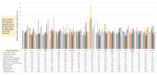 Eurasia Group developed a methodology to assess and rank national responses across three key areas: healthcare management, political response, and financial policy response [32]. The top five countries with the best global response to COVID-19 that they ranked are Taiwan, Singapore, South Korea, New Zealand, and Australia. Taiwan had 443 COVID-19 cases and 7 deaths in total. To achieve such an admirable COVID-19 response, Taiwan closed its border and banned exports of surgical masks. Instead of closing businesses, Taiwan used mobile tracing apps and aggressive precautionary measures to control the virus spread [33]. Singapore had a total of 38,000 cases and 25 deaths. Singapore relied on contact tracing and widespread testing to curtail the pandemic and spent 20% of its GDP to maintain the national economy [34,35]. South Korea used extensive testing, contact tracing, and financial aid to curtail the pandemic to 11,000 cases and 276 deaths, and maintain socioeconomic conditions [36,37]. New Zealand used aggressive lockdown, national border closure, and financial strategies to manage pandemic to 1000 cases and 22 deaths, and maintain national socioeconomic health [38,39]. Australia contained its COVID-19 cases to below 8000 and deaths to 102 using a coordinated approach across the government including financial relief for the citizens [40,41]. The countries that have the highest number of COVID-19 cases and deaths were unable to understand the pandemic effects and did not take timely actions.