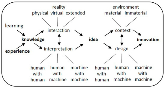 Earlier, the interpretation of knowledge took place exclusively between humans or by one person alone examining the validity of existing knowledge. With technologies advancing, computers, ICTs and other machines have entered the interpretation process of existing knowledge. A connection between humans and machines facilitates the interpretation, speeding up the process with rapid calculations or browsing the databases. A more recent and rapidly developing scene is the validation and interpretation of knowledge through machine-to-machine learning. Machines alone are able to develop knowledge through machine learning and algorithms of artificial intelligence (AI) that simulates human intelligence in machines programmed to think like humans and mimic their actions and. This is taking place in various fields, including engineering and medicine, in which machines with AI-generated algorithms learn and perform better, for example, identifying and defining inconsistencies. Different human-to-human, human-to-machine and machine-to-machine combinations interpret existing knowledge differently. In the end, creativity—which is an interaction among aptitude, process, and environment through which an individual or group produces a novel and useful product within a social context [27]—is no longer humans’ sole privilege being supported only by connections between humans.