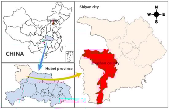 Zhushan County is located in the northwest of Hubei Province of China. It encompasses a total area of 3587.8 km2 between the coordinates 109°32′ E and 110°25′ E longitude and 31°30′ N to 32°37′ N latitude Figure 1. The region has a subtropical monsoon climate with abundant rainfall and four distinct seasons. There are a total of 646 rivers, with a river network density of 0.76 km/km2. The major geomorphic types are mountainous, hills, rift basins, and valley terraces. The study area includes seven geological age units, which are Sinian, Cambrian, Ordovician, Silurian, Cretaceous, Tertiary, and Quaternary formations. The main lithology of these formations is magmatic, clastic, and carbonate rocks. The Quaternary covers are mainly distributed in the northern and northeastern parts of the study region.