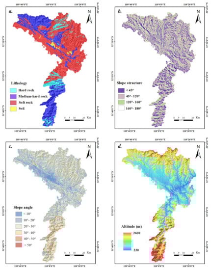 Slope structure is an important property describing the type of slope and an important indicator of slope stability. It reflects the positional relationship between rock layers and the empty surface of the slope. Slope structure can usually be divided into forward slope, diagonal slope, cross slope, and reverse slope. Different slope structure types have great differences in the development characteristics and degree of landslides. For example, the forward slope is prone to large-scale landslides, controlled by the lithological interface and weak interlayer. Based on the raster calculation function of ArcGIS, this paper uses the angle between the slope aspect and the rock layer inclination (range 0–180°) to characterize the slope structure of the study area [58] and divide the slope structure into 4 types according to the calculation results: 0–45°, 45–120°, 120–160°, and 160–180°, as shown in Figure 3b.