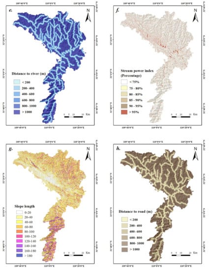 Frequent human engineering activities will exacerbate landslide hazards. A large number of landslides that occurred on embankments or cut slopes confirm this conclusion [77,78]. Therefore, this study, like many others [12,21,54,63,68], regards the distance to road as an important CF in LSM. According to the topographic map of Zhushan County, the distance to road was obtained and divided into 6 classes (Figure 3h).