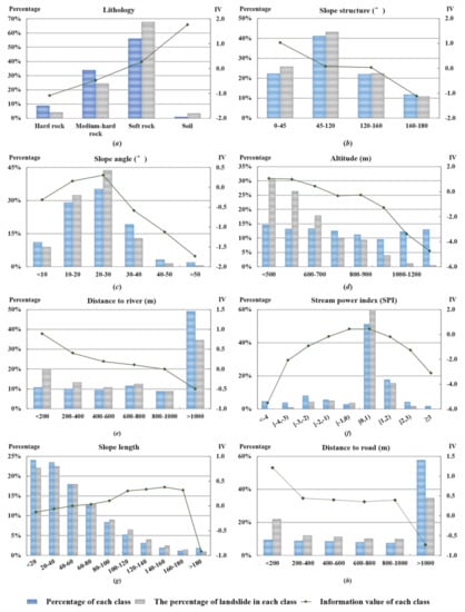 In order to show the relationship between each CF and the occurrence of landslide, three parameters are given in the form of polyline-histogram, respectively: (1) the percentage of each class of each CF, i.e., ; (2) the percentage of landslides in each class of each CF, i.e., ; (3) the IV of each class of each CF Ii. See Section 2.2 for specific calculations.