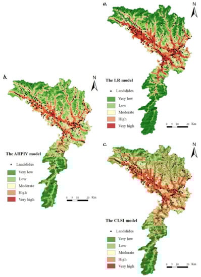 Landslide susceptibility (LS) maps of the three models.(a) the LS map of the LR model; (b) the LS map of the AHPIV model; (c) the LS map of the CLSI model.