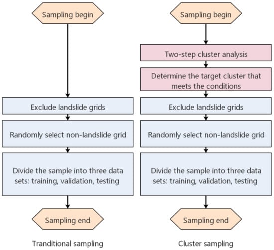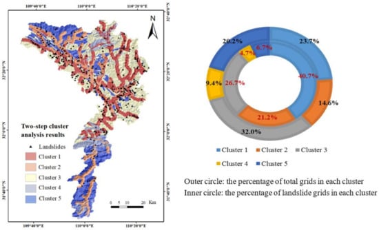 To deal with the weight determination through BPNN, two types of samples are needed to construct a BPNN model. One is landslide samples, and the other is non-landslide samples [5]. Since regional landslide survey data are usually incomplete, the non-landslide area identified by the traditional sampling method has a large sampling error; this error greatly affects the prediction results due to the fact that sample preprocessing can improve the accuracy of neural network models. This study optimized the selection of a non-landslide data set, using the two-step cluster analysis (TSCA). A brief introduction of TSCA is given in a previous study [6].