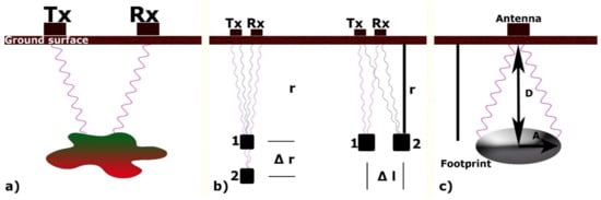 The transmitter and a receiver are set in a stationary configuration, moving them over the surface to reveal reflections from the subsurface [35]. This configuration is depicted in Figure 1a.