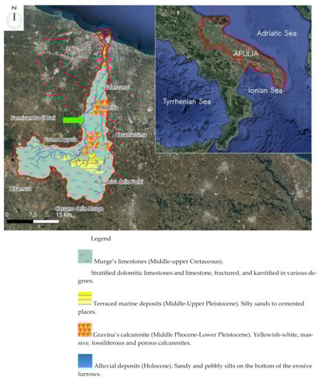- Servizio Geologico D’Italia. Geologica d’Italia, in Scala 1:100.000. F° 177 «Bari» and F° 189 «Altamura», Libr. Di Stato; Servizio Geologico D’Italia: Rome, Italy, 1966. [Google Scholar]