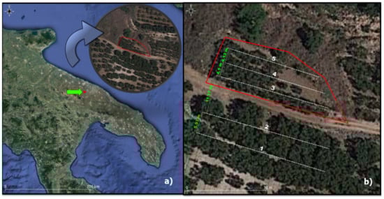 The GPR survey was carried out on one of the Picone Torrent slopes, in the countryside of “Sannicandro di Bari” (Bari Province), in the “Parco delle Grotte” area, a zone subjected to landscape restrictions. The area sometimes provides steep walls and dense and intricate vegetation representing ecological corridors necessary to the survival of many animal and plant species that survived the territory’s intensive exploitation. Some of them are subjected to protection initiatives (e.g., Natura 2000 Network) [46].
