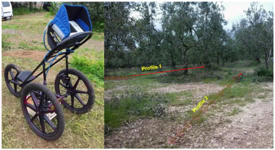 Profile no. 1 (Figure 3, Figure 4 and Figure 5) represents the undisturbed soil below a centuries-old olive tree grove; this profile was acquired to emphasize and highlight the presence of natural rock bodies then disappeared in subsequent profiles. Profile no. 2 (Figure 3 and Figure 6) was acquired on a path along with the shallow erosive furrows’ side limit.