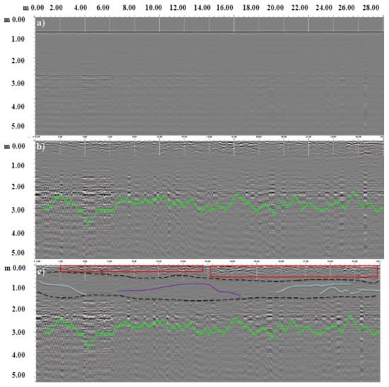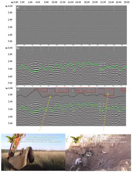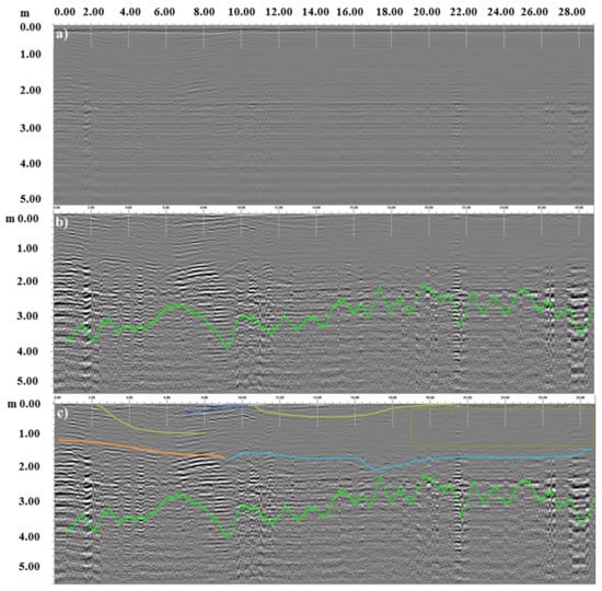 It was possible to interpret the signal qualitatively by a maximum depth of about 3 m (green lines in all Figure 5b,c, Figure 6, Figure 7, Figure 8 and Figure 9b,c) using a function of the processing software that analyzes the noise and signal loss from scan to scan and provides an estimate of the effective depth penetration. The output of this function is shown as a green line on the screen.