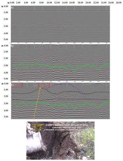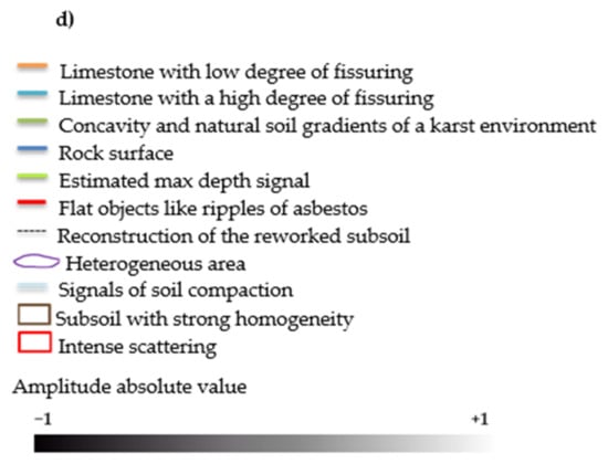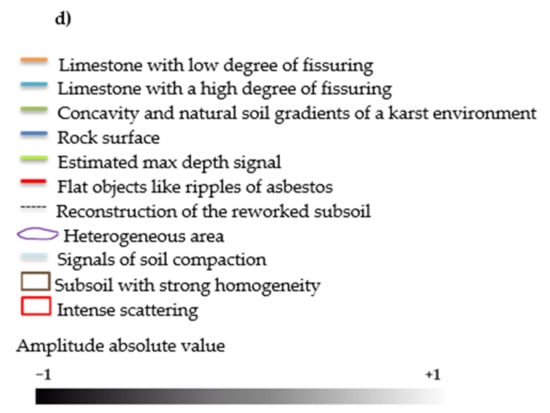 Along profile no. 1, acquired outside the waste disposal site’s limits, three different signal patterns recognized as superficial horizontal and subhorizontal reflectors were observed and underlined in Figure 5c by orange, light blue, and green lines. In the same profile, natural bodies like limestone with different degree of fissuring, concavities, and soils gradients, attributable to the signals observed, that disappeared in the other profiles were present. It is known that GPR is a helpful medium to reveal the presence of holes and underground caves [56,57,58,59,60,61,62,63,64]. Moreover, a relatively homogeneous layering of the subsurface reveals a peculiar horizontal stratification that shows noise and evident heterogeneity.