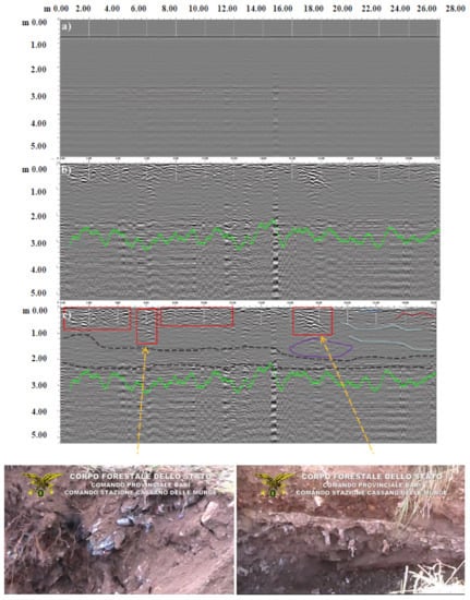 In these profiles, there were anomalies attributable to somewhat suspicious soil and subsoil movements and, in any case, not found in the profile comparison because they were really different if compared to those of an undisturbed and homogeneous soil (Figure 4) and thus probably due to illegal activities that caused rehashing and mixing the soil with waste.