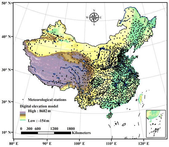 Spatial distribution of meteorological stations on a digital elevation model in China.