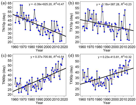 Year-to-year variations in temperature extremes (Tt in Equation (1)) from 1992 to 2018: (a) TN10p; (b) TX10p; (c) TN90p; (d) TX90p.