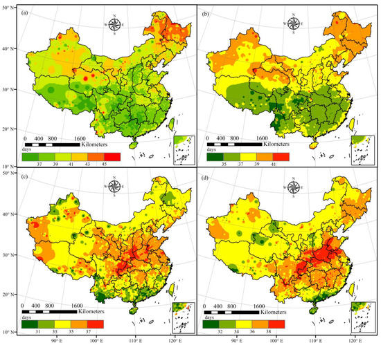 The spatial patterns of annual mean cool nights (TN10p), cool days (TX10p), warm nights (TN90p) and warm days (TX90p) over the period from 1960 to 2018 are displayed in Figure 3, which were interpolated at a spatial resolution of 1 km × 1 km by using the inverse distance weighted (IDW) method in a GIS environment with default parameters. The maximum value of TN10p was 55.4 days/year, and the low values were mainly located in the Tibetan Plateau, south of the Yangtze River, and Shanxi Province, with a minimum value of 25.4 days/year. The regional average value of cool nights was 39.8 days/year across the country, with a standard deviation of 1.9 days/year. Cool nights above the average value affected 51.6% of China’s total land area. For the cool days, the high values were mainly distributed in the northeast and northwest, with a maximum value of 50.7 days/year. The low values were mainly located in southwestern China, with a minimum value of 29.6 days/year. The regional average TX10p was 37.8 days/year, and the standard deviation was 1.6 days/year, which was smaller than that of the cool nights, indicating a smaller cool day spatial variation. Cool days with values greater than 37.8 days/year accounted for approximately 53.4% of mainland China. The average values were 34.5 days/year and 35.7 days/year, and the standard deviations were both 1.5 days/year for TN90p and TX90p, respectively (Table 3). High values of TN90p were mainly observed in the middle of China, while low values were mainly distributed in South China. For TX90p, the high values were mainly located in the middle of China, especially in Guizhou and Henan Provinces and their surrounding areas (Figure 3d). The low values of TX90p were mainly distributed in southern and northwestern China. Values greater than 34.5 days/year accounted for 51.3% for TN90p, and values above 35.7 days/year accounted for 44.7% for TX90p. The spatial variations in the four temperature extremes indicated the important role of nonstationary natural and human forces. Compared with other regions, Northeast and Northwest China showed more cold extremes and fewer warm extremes; the area between Yellow and Yangtze rivers experienced more warm nights, while this pattern moved south for warm days.