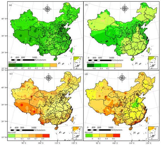 Spatial trends in temperature extremes at a resolution of 1 km × 1 km in China from 1960 to 2018: (a) TN10p; (b) TX10p; (c) TN90p; (d) TX90p.