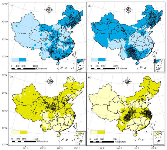Figure 5 displays the spatial heterogeneity of temperature extremes during 1992–2018 by using the spatiotemporal model with respect to the four covariates, where the heterogeneous impact of locations is clearly shown. Considering the NTL time series data spanning from 1992 to 2018, we conducted our analysis during this period in the following text. A spatial estimate exceeding 1 means strong spatial heterogeneity, and ‘+’ denotes the extremes with high spatial heterogeneity identified to at least the 95% probability level. The variability in cool nights (TN10p) attributable to location was high, mainly in the northeast, part of the northwest, southeastern coastal area and Central China (Figure 5a). The areas with high spatial heterogeneity of TX10p were mainly observed in northern China, Guizhou Province and its surrounding areas (Figure 5b). The spatial variations in warm nights (TN90p) were more prominent over northwestern China than in the southeast and were significant in Gansu Province, parts of the Tibetan Plateau, Yunnan Province and the Xinjiang Uygur autonomous region. For TX90p, areas with strong spatial heterogeneity mainly included the northern part of China, and areas with strong spatial heterogeneity identified to at least the 95% probability level were mainly located in Gansu Province and its surrounding areas.