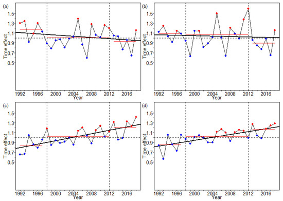 The temporal effect on the temperature extremes is presented in Figure 6. The points above the dashed line indicate obvious variations in temperature extremes throughout the year, and the red points denote large variations occurring with probabilities larger than 95%. The relatively large variation was 9 years for cool extremes (TN10p and TX10p) and 10 and 9 years for warm extremes (TN90p and TX90p), respectively, at probability levels greater than 95%. The temporal variations in warm extremes mainly occurred after 2004. In addition, the Mann–Kendall statistical test demonstrated that significant increasing trends in the temporal heterogeneity of warm extremes were observed from 1992 to 2018, with significantly faster increases in the years between 2012 and 2018 (Figure 6c,d) according to Student’s t-test; this was the period when China implemented a new urbanization agenda. Student’s t-test also showed that significant differences existed in the temporal variability of warm extremes (TN90p and TX90p) from T1 (1992–1997) to T2 (1998–2012) and T2 to T3 (2013–2018) (Table 4), which may be due to the strong El Niño event in 1997 and the national new urbanization development stage after 2012 [48,49]. However, the year-to-year variations in cool extremes did not show any trends at a significance level of 5%.