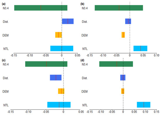 Effects of different forces on temperature extremes (β in Equation (1)): (a) TN10p; (b) TX10p; (c) TN90p; (d) TX90p. N3.4 denotes the Niño 3.4 index; Dist. means the distance to the sea; and DEM and NTL denote the digital elevation model and nighttime light data, respectively.