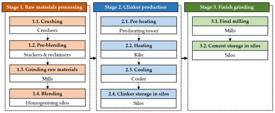 Cement production process. The colored boxes show the sequential operations, while the white boxes summarize the process machinery.