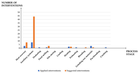 Figure 3 shows the applied and suggested interventions by considering the process stage on which they acted to reduce energy consumption, whereas Figure 4 summarizes the same measures according to the process machinery (see Figure 1).