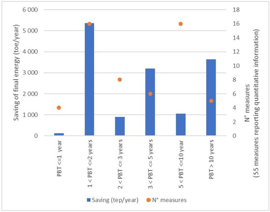 Suggested technological measures can also be analyzed distinguishing for their payback time class (PBT, Figure 5). In this case, 55 measures report quantitative information: measures with PBT between one and two years represent 40% (5.3 ktoe/year) of total annual potential saving. Further 20% of potential saving is associated with measures having a PBT between 3 and 5 years (3.2 ktoe/year).