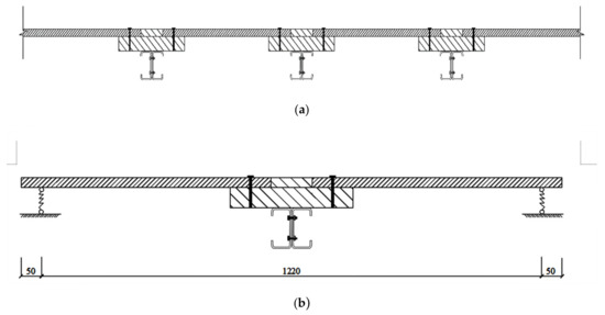 To implement the test and meet the boundary conditions of vertical free deformation of the unconnected section of the floor slab in Figure 3b, an elasticity support composed of a rectangular extruded foam board and glulam with a cross-sectional size of 100 mm × 50 mm was set in the test. During the test, the elastic support did not produce an excessive reaction force to the floor slab that hinders the loading of the floor slab. The test pieces of the composite floor are shown in Figure 3.