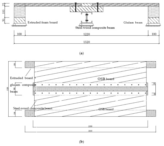 (a) 1-1 section picture of the prefabricated steel–wood composite floor test piece; (b) structure drawing of the composite floor test piece (mm).