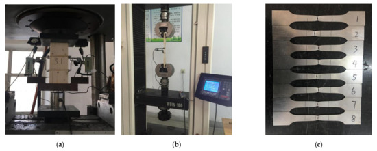 In accordance with the “Test Method for Tensile Strength of Wood Along the Grain” (GB/T 1938-2009) and the “Metallic Material Tensile Test-Part 1 Room Temperature Test Method” (GB/T 228.1-2010), the wood and steel used to make the test pieces were tested. According to the along-grain compression test of 15 prismatic glulam specimens (Figure 4a), the along-grain compressive strength of the glulam was 50.10 MPa, and the compressive elastic modulus of the glulam was 10,722.13 MPa. According to the along-grain tensile test of the glulam specimens (Figure 4b), the tensile strength along the grain was 74.61 MPa, and the tensile elastic modulus was 9912.00 MPa. According to the material property test of the steel (Figure 4c), the elastic modulus was taken as 195,687.65 MPa; the Poisson’s ratio was taken as 0.3; the yield stress was taken as 225.41 MPa and the tensile strength was 332.72 MPa. The material parameters of OSB [15], extruded board [16], steel glue [17] and other components are shown in Table 2.