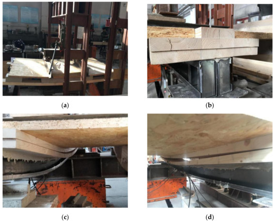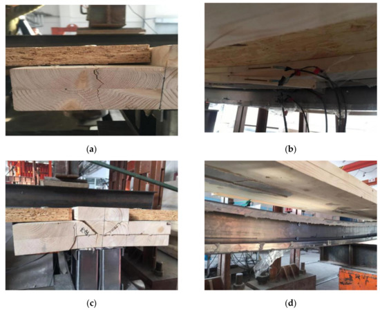 The failure mode of the ZHLB-2 specimen is roughly that the glued surface of the thin-walled steel and glulam is broken and the flange on one side of the glulam is broken, as shown in Figure 7. In the failure loading stage, as the load increases, the bending deformation of the composite floor gradually increases. The cemented surface of the steel–wood beam mid-span is broken, and the flange on the side of the glulam has vertical cracks (as shown in Figure 7a). The OSB above the foam beam of the plastic board is sinking and deformed downward. When the load reaches about 60 kN, the cemented surface of the mid-span part of the laminated beam is degummed, and the bottom of the glulam beam changes from a compressed state to a tensioned state, causing the bottom of the glulam beam to be broken (as shown in Figure 7b). When the load reaches about 80% of the maximum bearing capacity, an oblique crack appears at the glulam bearing position; the load continues to increase, and the oblique crack gradually expands laterally (as shown in Figure 7c). This is because when the specimen is approaching the ultimate load, the surface load on the OSB plate is transformed into a larger linear load and added to the flange of the composite beam; the shear stress in the flange of the laminated beam gradually increases until the main tensile stress in the beam exceeds the tensile strength of the wood’s transverse grain, forming a beam crack of about 45°. At this time, the glued layer of glulam and the glued surface of thin-walled steel also experienced degumming failure, which accelerated the lateral expansion of diagonal cracks. When an oblique crack appeared on the flange of the composite beam, damage occurred on the composite beam from the middle of the span to the bonding surface between the glulam and the thin-walled steel of the support, and finally, the thin-walled steel and the glulam were completely peeled off. At this time, the pressure sensor reading suddenly dropped to about 50% of the maximum bearing capacity, the composite floor could not continue to be loaded and the steel beam underwent very large plastic bending deformation after unloading (as shown in Figure 7d).