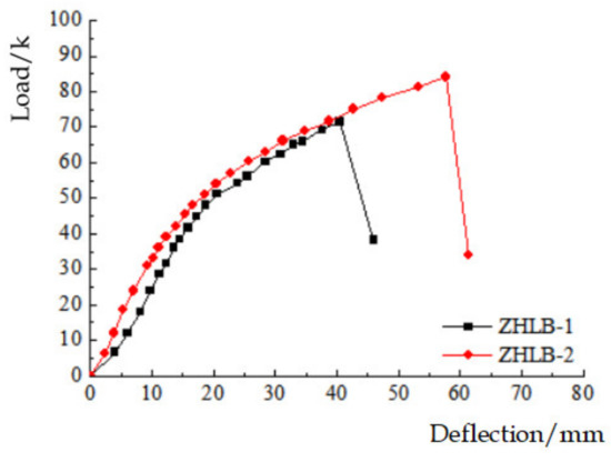 By analyzing the experimental data, it can be concluded that the ultimate bearing capacity of the specimen ZHLB-2 is 18.31% higher than that of the specimen ZHLB-1; the corresponding mid-span deflection deformation is 42.41% higher and the ultimate bending moment is 21.43% higher. After the two groups of tests were completed, the mid-span deflection limit, ultimate load and bending moment of each group of specimens were summarized and are presented in Table 3.
