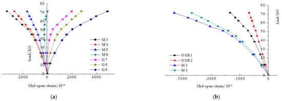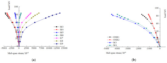 According to the two sets of test data, the load–strain curve of the composite floor was drawn as shown in Figure 10 and Figure 11. The analysis of the data shows that the strain value of each measuring point at the initial stage of loading increases linearly with the increase in the load. As the load increases, there is a tendency to deviate outwards. This is due to the elastoplastic deformation of OSB panels, glulam and thin-walled steel, which presents nonlinear changes. When the two sets of steel–wood composite slabs fail, the compressive strains on top of the OSB slab are 1332 and 1702 µɛ, respectively; the compressive strains on the top of the glulam beam are 3275 and 4498 µɛ; the tensile strains of the thin-walled steel are 4884 and 13,503 µɛ, respectively. When the ZHLB-1 and ZHLB-2 specimens are damaged, the full cross-section of the OSB is compressed, the amount of plywood in the compression zone reaches two layers and the full cross-section of the thin-walled steel is tensioned. Measuring point OSB2 and measuring point M4 are the OSB plate strain change measuring point and the glulam strain change measuring point, respectively, located at the same section height. The deformation of the two measuring points is similar at the beginning of loading, but as the load increases, because the OSB plate has vertical deformation, the deformation of the two members is inconsistent, and the strain of the two members with the same section height is quite different.