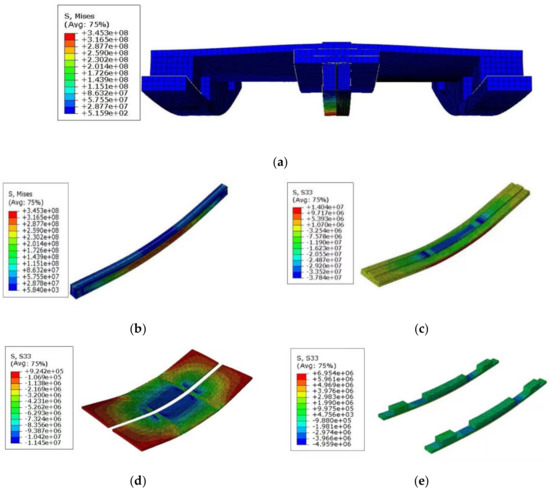 Stress–field nephogram of ZHLB–2 specimen. (a) Combined floor deformation stress–field nephogram. (b) Stress–field nephogram of thin–walled steel beam; (c) stress–field nephogram of glulam beams; (d) OSB plate stress–field nephogram; (e) extruded board + glued wood stress–field nephogram.