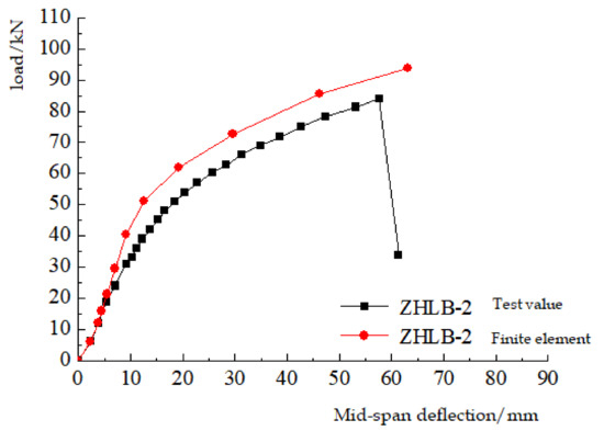 The comparison between the finite element analysis results and the test results is shown in Table 5. The data were extracted from the model and a load–deflection curve was drawn for comparison with the test results, as shown in Figure 14.